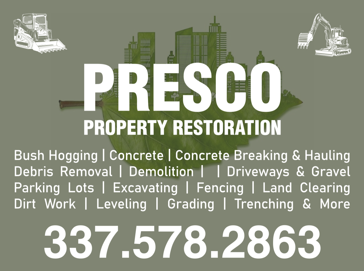 Presco Property Restoration serves New Iberia and the surrounding region with a complete range of property services, from land clearing and grading to concrete, demolition, and site preparation. Expansion across Lafayette and Youngsville has increased demand for contractors who understand local soil, seasonal factors, and the variety of work rural and commercial properties require. You need someone who can adapt to different job types without juggling multiple vendors or timelines.